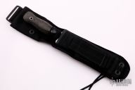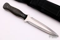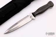 Maker statement: "The Shiva is a beautiful, bilaterally symmetrical double-edged dagger. Ostensibly designed for the same mission parameters as the legendary Fairbairn -Sykes Commando Knife, it has a number of significant design improvements which broaden its functional scope considerably. Most notable perhaps, is the handle, which flares out from a gentle lemon-drop to a knob-like pommel, which greatly facilitates a firm grip, and almost eliminates the problem of rolling in the palm. The geometry of the double hollow ground edges make them both striking in appearance and singularly functional. The Shiva gives you the best attributes of a stabbing pike and a straight razor." Black canvas micarta handle with hollow steel pins. Blade is .243" thick and 1.218" deep with full tang construction. Has a hand rub satin finished double-edged blade. Comes with black nylon sheath. Has a light scratch on the blade, otherwise excellent condition.