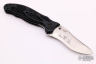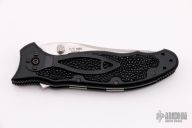 This knife by Kershaw features a satin finished blade with dual thumbstuds and a flipper. The handle has a black aluminum frame, stingray skin inlays and a tip up or down black stainless steel clip. Excellent condition. Comes with box and papers.