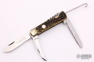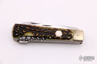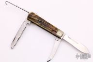 This legendary knife features satin finished stainless steel (Rostfrei) blades. The handle has nickel silver bolsters, stag scales, brass liners and stainless steel springs. Has brass hexagon inlay stamped "008" or "800" not sure which is correct. Main blade is a lockback, lock tab is stamped "83274". Has a drop point blade, a hawkbill blade with rounded tip, saw blade with bottle opener, carry hook, and cork screw. Comes with original box and papers. Patina on bolsters, but overall good condition.