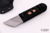 This Kiridashi by Ben Tendick of BRT Bladeworks features a bead blasted blade. The handle is comprised of a Japanese style handle wrap over hidden tang construction and a hammered copper menuki. Includes kydex sheath. New from Maker.