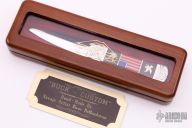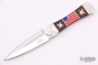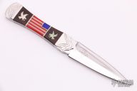 This Koji Dagger by Buck Knives has a custom handle by David Yellowhorse. Features a mirror double-edged blade, .113" blade stock and .823" blade depth, full tang construction. The handle has milled stainless steel bolsters and butt, ironwood and American flag inlay with lapis stone inlays for the stars.  Comes in wooden display box, outer box and COA. Excellent condition.  #12 of 25