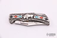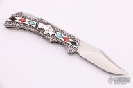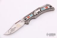 This "Sacred Buffalo" folder is a David Yellowhorse Premier Edition by United Cutlery. It features a satin finished clip point blade with swedge and nail nick. The blade is marked with his signature and logo. The handle is comprised of carved sterling silver with turquoise, black jet and orange piny oyster stone inlays over a steel lock back. Numbered 0164/2500. Includes original box and COA. Excellent condition.
