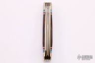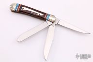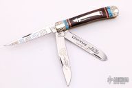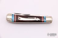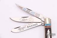 This custom slip joint by United Cutlery has a custom handle by David Yellowhorse and is from a limited edition of 600 pieces. Nickel silver bolsters and figure of the Anasazi. Turquoise, red and black spiny oyster spacers. Each of the 3 blades are etched using three colors, the middle blade is marked "116" with the Yellowhorse symbol. Excellent Condition.