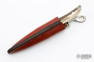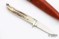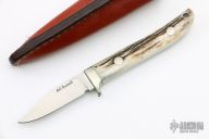 This knife by AG Russell has a satin finish blade with .093" blade stock and .561" blade depth, full tapered tang construction with nickel silver guard, and stag scales. Comes with a brown leather dangle sheath. Has some patina on the guard, otherwise excellent condition.