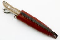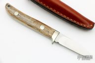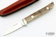 This knife by AG Russell has a satin finish blade with .085" blade stock and .594" blade depth, full tapered tang construction with nickel silver guard, and mammoth ivory scales. Comes with a brown leather dangle sheath. Has some patina on the guard and some checking around the pins, otherwise excellent condition.