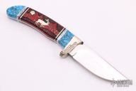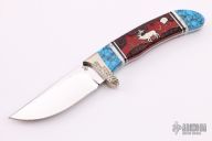 This Gen5 hunter by Buck Knives features a David Yellowhorse handle, has a drop point mirror polished blade with .117" blade stock and .991" blade depth, full tang construction. The handle has a nickel silver guard and turquoise/jasper/nickel silver scales. Comes with original box and papers. Excellent condition. #83/250