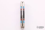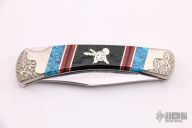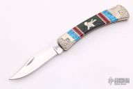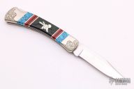 This Buck Model 110 knife Customized by David Yellowhorse is a lock back with nickel silver bolsters, turquoise, buffalo scales with red/black/nickel silver spacers. Mirror polished blade. Strong lock up. Includes a wood display case. Has some light scratches, otherwise excellent condition.