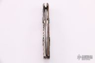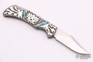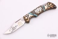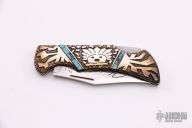 This "Spirit Stalker" folder is a David Yellowhorse Premier Edition by United Cutlery. It features a satin finished clip point blade with swedge and nail nick. The blade is marked with his signature and logo. The handle is comprised of carved sterling silver with turquoise inlays over a steel lock back. Numbered 0127/2500. Includes original box and COA. Excellent condition.