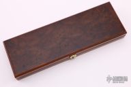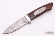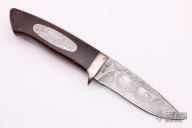 This VERY RARE drop point features a spear point Leopard IV Damascus blade, 3/16" blade stock and 1" blade depth, full tang construction. Leopard IV Damascus is forged from the barrels of the famed German Leopard battle tank and features 600 layers. The handle has nickel silver bolsters rosewood scales with sterling silver pins. Engravable insets on both sides are also Leopard IV Damascus. Comes with original wooden box. Has some oxidation spots on the escutcheons and some patina on the guard, otherwise good condition.