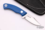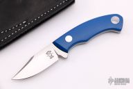 This custom Pocket Bowie from Tom Krein is crafted from 1", CPM 154 stock with a thickness of 1/8". The handle scales are blue Westinghouse micarta with black liners. This piece has a large lanyard tube and comes in a black leather sheath.  Excellent Condition.