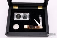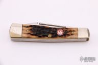 This Case folder features two mirror polished blades. Nickel Silver front and rear bolsters with jigged bone covers with a Ruger escutcheon. Brass liners and steel springs. Comes with the original box case and coin. Has some patina, otherwise excellent Condition. #412