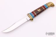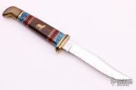This knife by Buck was customized by David Yellowhorse. Mirror polish blade with brass guard and pommel. Brass wolf inlay in ironwood scales. Spacers of turquoise, brass, black, and red jasper. Comes in original wooden display box with engraved plaque. Excellent condition.