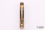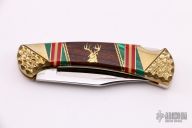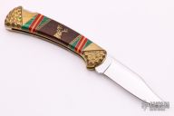 This Buck Model 112 knife Customized by David Yellowhorse is a lock back with brass bolsters, ironwood, malachite, jasper and brass spacers. Mirror polished blade. Strong lock up. Comes with original box. Excellent condition.