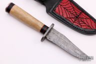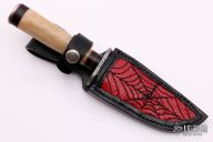 This knife features a multi-bar mosaic Damascus blade with fileworked spine, .124" blade stock and 1.119" blade depth, hidden tang construction. The handle has a fileworked Damascus guard, oosic grip with black/red spacers and a spyderweb mosaic Damascus butt (butt plate is off center alot, but not loose, its weird) Comes with a black leather sheath with red reptile skin inlay. Has some minor oxidation and the butt plate is messed up. Good condition otherwise