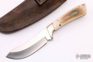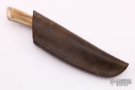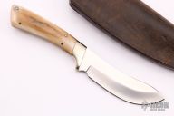 This knife features a satin finished blade with .116" blade stock and 1.053" blade depth, full tang construction. The handle has nickel silver bolsters, mammoth ivory scales with black liners. Comes with a brown leather sheath. Has a few light scratches, otherwise excellent condition.