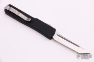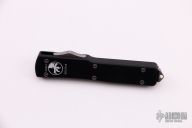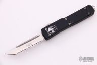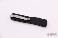 This UTX-70 OTF automatic by Microtech features a T/E satin finished blade with full serrations. The handle has a black aluminum frame with blasted stainless steel tip down clip. Serial number 26951 and dated 06/2015. Comes with original box and papers. Excellent condition.