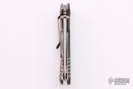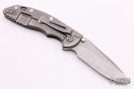 This XM-18 Spanto by Rick Hinderer Knives features a 3.5" stonewashed blade, notched thumbrest and dual thumbstuds. The handle has a green G-10 scale, and stonewashed titanium handle/clip. Clip can be mounted for tip up or down carry. Nice lockup, seating, and detent. Excellent condition.