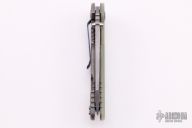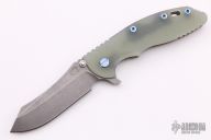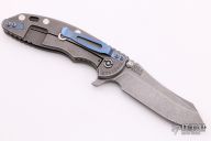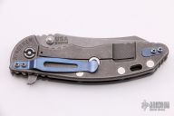 This XM-18 Skinner from Rick Hinderer Knives features a 3.5" stonewashed blade, notched thumbrest and flipper, dual thumbstuds. The handle has a natural G-10 scale, and stonewashed titanium handle complemented by a blue anodized tip down pocket clip, fuller tab and standoffs. Clip can be mounted for tip up or down carry. Nice lockup, seating, and detent. Excellent condition. Comes with original box.