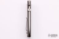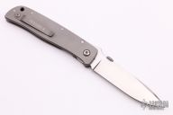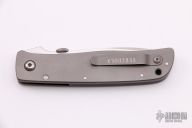 This knife from Bob Terzuola features a drop point blade with swedge, thumb disc and notched thumbrest. The handle is comprised of a full titanium frame and lockside liner over black backspacer, titanium tip up clip with logo.  Includes a padded zippered case.  Excellent condition.