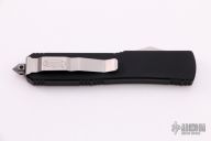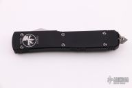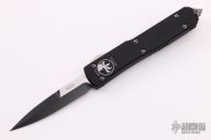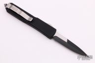 This Ultratech OTF automatic by Microtech Knives features a D/E black bayonet grind blade with a sharpened top edge. Stainless steel clip, tip down. Glass breaker. Black aluminum frame. Dated 03/2015 and serial number 52775. Comes with original box and papers. Excellent condition.