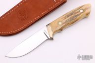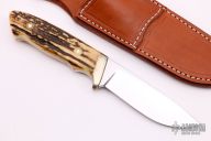 This hunter by Bernard Sparks features a mirror polished drop point blade, .169" blade stock and 1.177" blade depth, full tapered tang construction. The handle has a brass guard and stag scales. This knife feels great in the hand - well-balanced and fitting. Comes with a brown leather sheath (not original). Has some light scratches, otherwise good condition.