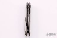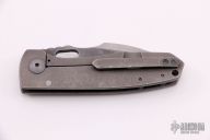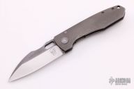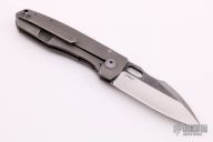 This EDMW Variant from Steve Karroll features a CPM3V two-tone finished blade with satin grinds and tumbled flats, notched thumbrest, and thumbhole. The handle has an orange peel finished titanium frame and a tumbled titanium clip positioned for tip up carry. Has blue anodized standoffs, and hardware. It has nice detent, blade seating and lockup. Pivots on caged bearings. Has some light scratches near the tip of the blade and shows some small scuffs on the frame and clip. Otherwise good condition.