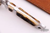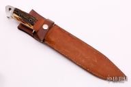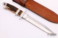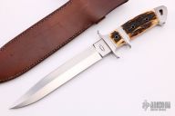 This integral Big Bear subhilt from Dietmar Kressler features a clip point hand rubbed satin finish blade with sharpened top edge, .206" blade stock and 1.252" blade depth at the ricasso. The handle is comprised of incredible stag insets and scales over red liners and integral construction with full tapered tang. Lanyard tube in pommel. Includes brown leather sheath with belt loop and a padded zippered case. Excellent+ condition. A beautiful piece.