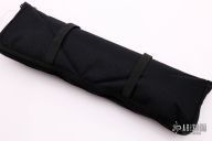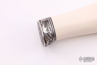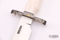 This Model 12-9 Sportsman Bowie by Randall Made Knives features a satin finished clip point blade with .234" stock. 1.713" blade depth, hidden tang construction. Model 14 blade grind with a sharpened top edge. The handle has a lugged sterling silver guard and pommel, black and fine silver and spacers. Comes with brown leather sheath. Has some patina on the silver. This knife was engraved by Ron Skaggs and has gold inlays in the guard. Beautiful engraving. Comes with a zippered case.