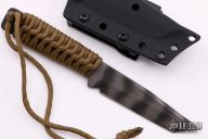 This WP by Strider features a tiger striped tanto blade, .191" blade stock and .984" blade depth, full tang construction. The handle has green paracord wrap. Comes with a kydex sheath. The blade has some light sheath marks, otherwise excellent condition.