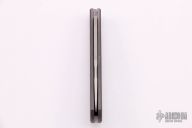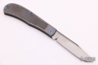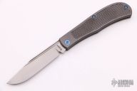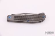 This Slipjoint by Richard Rogers features a bead blasted clip point blade with fullers. The handle has tumbled titanium covers with golf ball textured zirconium inlays, anodized titanium hardware with spiral milled custom pivot, steel spring with half-stop, flush in all positions. Comes with original box and COA dated Sept. 2020. New from maker (from another dealer).