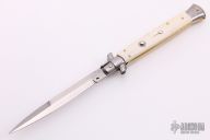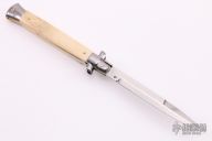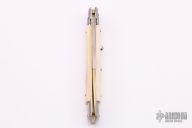 This Swivel Bolster Auto has a stainless steel spear point blade. The handle is composed of a steel front and rear bolsters, brass liners all complemented by white bone scales. Excellent Condition.