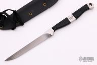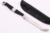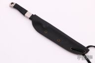 This Spike by Barry Dawson features a satin finished blade.  .258" Blade Stock.  .468" Blade depth.  The handle has black epoxy soaked cord wrapped handle.  Comes with a kydex sheath. Has some scuffs on finish, otherwise the knife is in excellent condition.