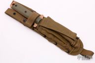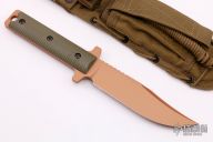This M12 Bowie by Les George features a bronze coated clip point blade with false top edge and notched thumbrest, .256" blade stock and 1.480" blade depth, full tang construction. The handle has textured green G-10 scales and black hardware. Includes an OD Green nylon SpecOps sheath. Nice heavy-duty knife, made for use!! New from maker.