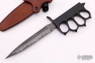 This Trench Dagger by Les George features a CTX-XHP Core San Mai Damascus double-edged blade with .185" blade stock, 1.004" blade depth, hidden tang construction. The handle has a cast brass knuckle guard grip with a skull crusher and black cerakote. Comes with a brown leather scabbard by Chattanooga Leatherworks. Comes with a zippered case. New from maker.