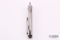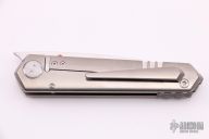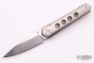 This icepick framelock front flipper from Sergey Rogovets features a satin finished blade with notched front flipper and a copper pin embellishment in the flats. The handle has a nicely contoured and tumbled titanium frame with a matching tip up pocket clip with hidden screws, notched zirconium backspacer. The front scale has wire mesh behind the hole pattern, has a very cool look. Nice detent, lockup and blade seating, rides on bearings. Custom milled pivot. Locks up with no play, has a D2 lockface insert. Knife is in excellent condition. Includes padded hard case and certificate of authenticity dated August 2020, s/n 2027. Blade steel is S45VN