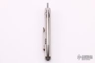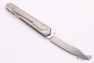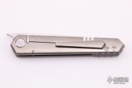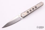 This iCePick XL framelock front flipper from Sergey Rogovets features a satin finished blade with notched front flipper and a copper pin embellishment in the flats. The handle has a nicely contoured and tumbled titanium frame with a matching tip up pocket clip with hidden screws, notched zirconium backspacer. The front scale has wire mesh behind the hole pattern, has a very cool look. Nice detent, lockup and blade seating, rides on bearings. Custom milled pivot. Locks up with no play, has a D2 lockface insert. Knife is in excellent condition. Includes padded hard case and certificate of authenticity dated August 2020, s/n 2028. Blade steel is S45VN