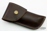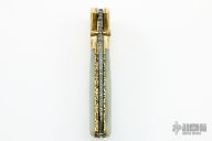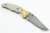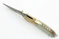 This knife features a Damascus blade with fileworked spine and dual brass thumbstuds. The handle has engraved brass bolsters, jade G-10 scales, fileworked brass liners, fileworked stainless steel backspacer. Nice lockup and blade seating. Comes with a brown leather sheath. Excellent condition.
