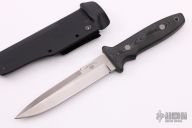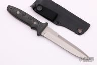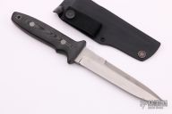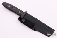 This Model 30 Battle Guard by Bob Terzuola features a bead blasted spear point blade with a false top edge and notched thumbrest, .188" blade stock and 1.097" blade depth, hidden tang construction. The handle is black linen micarta with non-slip grip on the bottom of the handle and a lanyard hole. Comes with kydex sheath. Has some light sheath marks on the blade, otherwise excellent condition.