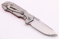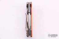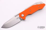 This Half Track from Hinderer Knives features a stonewashed blade with swedge, fullers, notched thumb rest and flipper. The handle is comprised of a bead blasted titanium frame complemented by a orange G10 scale. Titanium clip is positioned for tip up, right hand carry. Has some light scratches, otherwise excellent condition.