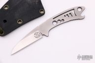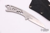 This neck knife features a bead blast blade with notched thumb-rest.  .126" Blade Stock. .727" Blade Depth.  The handle has holes and a bottle opener at the butt. Comes with a kydex neck sheath. Light scratches are visible on the blade otherwise the knife is in Excellent Condition.