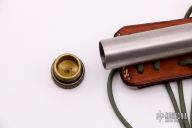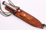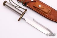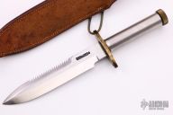 This Model 18 by Randall Made Knives has a 7.5" stainless steel blade with sawteeth and sharpened top edge, .244" blade stock and 1.382" blade depth. The handle has a brass double guard, and stainless steel handle. Brass guard and butt cap. Comes with brown leather sheath. Has some light scratches and patina, otherwise excellent condition.