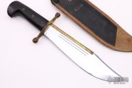 This vintage Bowie from Case Knives features a mirror polished clip point blade with false top edge and brass back parry guard, .173" blade stock without the brass parry guard and .238" blade stock with the brass parry guard, 2.075" blade depth, hidden tang construction. Daniel Boon Etching on presentation side. The handle is comprised of brass double guard wit a black composite handle over hidden tang construction. Includes original leather sheath with belt loop. Has some scratches, otherwise excellent condition for its age.