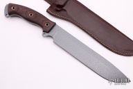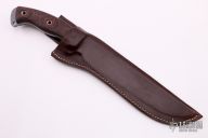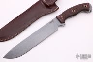 This Battle Mistress Ergo 2 from Busse Combat Knife Company features a tanker grey coated drop point blade, .235" blade stock and 1.754" blade depth, full tang construction. The handle has red/black G-10 scales with hollow pins. Exposed tang with lanyard hole. Comes with a brown leather sheath by Azula. Excellent condition.
