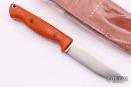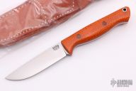 This Gunny Hunter by Bark River Knives features a satin finished blade with .133" blade stock and .934" blade depth, full tang construction. The handle has orange fire burlap micarta scales with red/brown liners. Comes with a brown leather sheath and original box. Excellent condition.