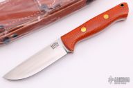 This Bravo-1 by Bark River Knives features a satin finished blade with .160" blade stock and 1.125" blade depth, full tang construction. The handle has orange fire burlap micarta scales with red/white liners. Comes with a brown leather sheath and original box. Excellent condition.