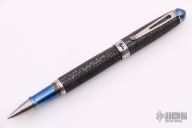 This Custom Screwtop Pen by Grayson Tighe is made from stainless infused carbon fiber with blue metallic fiberglass center line on cap and body. Solid titanium hardware that has been selectively heat colored. Comes with beautiful presentation box. New from maker. Takes a Schmidt refill.