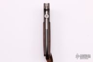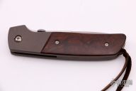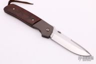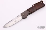 This ATCF by Bob Terzuola features a tumble finished blade with false top edge, notched thumbrest and a thumbdisc. The handle has blasted and anodized titanium bolsters, desert ironwood burl scales and backspacer, anodized and blasted titanium liners. Nice detent, lockup and blade seating. Has a few light scuffs, otherwise excellent condition. Comes with a zippered case.