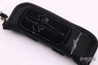 This Custom Combat Troodon by Marfione Custom Knives features a hand-ground two-tone DLC Apocalyptic finished blade with satin flats. The handle is hand sculpted black aluminum with ringed DLC finished hardware and stainless steel pocket clip. The clip is marked "A. Marfione" and "S. Marfione" and dated 03/2019 and s/n 001, and dagger logo is on the clip. Comes with original box, nylon zippered case and papers. Excellent condition.