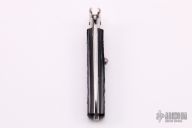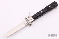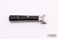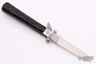 This vintage automatic done by Maserin and De Nardo in Maniago, Italy features a satin finished blade. The handle has steel bolsters, liners and backspacer, has jigged black plastic (bakelite?) scales. Has lever on the spine to unlock the knife. Has safety. Nice action, detent and lockup. Has a few light scratches, otherwise excellent condition for its age. Has shotgun sell pulling bolsters for 16 gauge and 12 gauge.