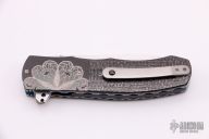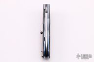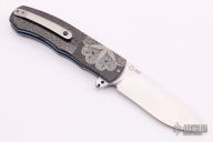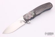 This L46 flipper by Andre Thorburn features a 2 tone blade with satin grinds and mirrored flats with notched thumbrest and flipper. Ceramic IKBS System (Ikoma Korth Bearing System). The handle has engraved/stippled zirconium bolsters, silver lightning strike carbon fiber scales, anodized titanium liners with fileworked spines, black G-10 backspacer and a titanium pocket clip, tip up carry. Nice detent, lockup, and blade seating. Comes with a zippered case and certificate of authenticity dated 2-6-2018. Excellent condition.